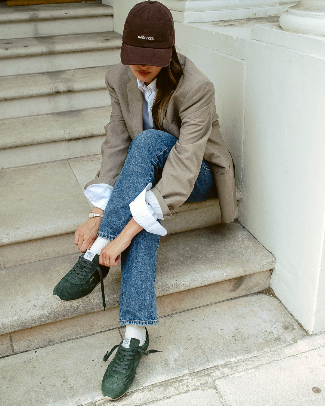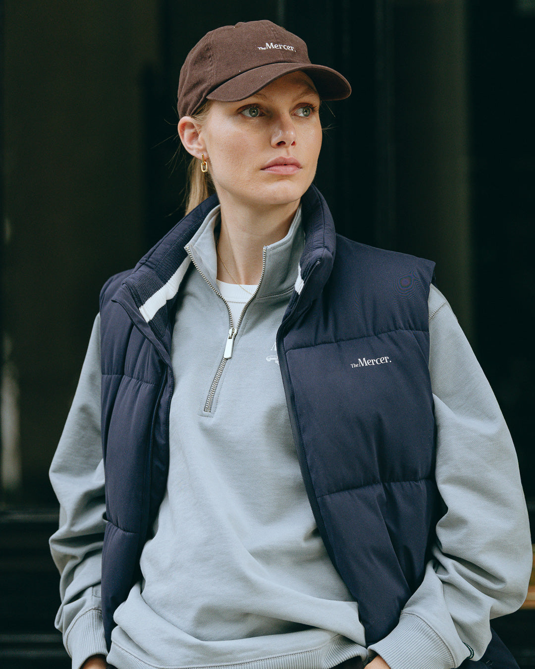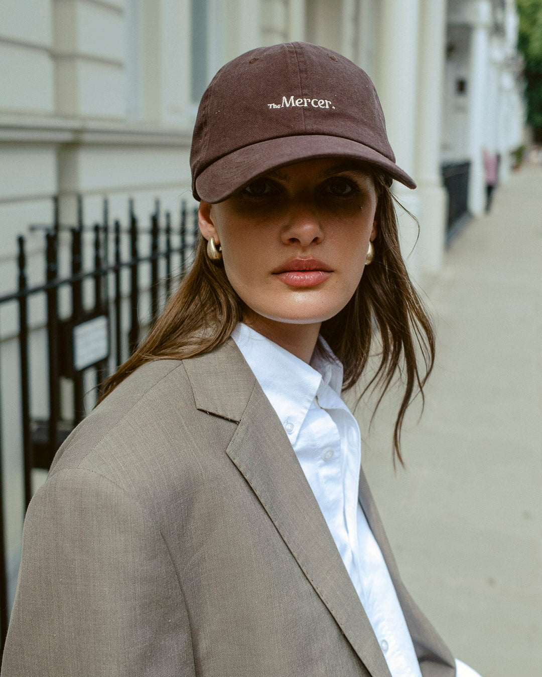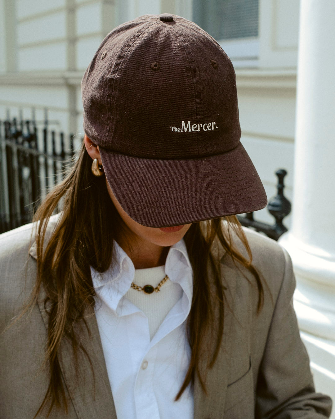 The Mercer cap is a relaxed and curved adjustable strapback with embroidery on the front and a loop label on the back.